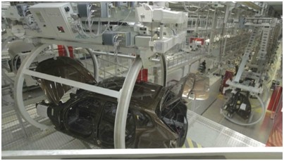 走在明亮、洁净的厂房里,你除了会不断颠覆对“工厂”和“车间”的传统理解,还很难忽略那些同时“飞在头上”和“走在身边”的车身。整个车间分为两层,合理利用了空中和地面物流的空间优势,可以让零部件和预装模块尽可能通过最短的路线输送到生产线上。